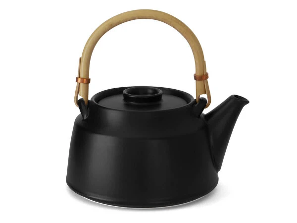 Teekanne von Tatsumi Kato (ceramic japan), traditionell von Hand gefertigt, in modernem Design. Die Manufaktur hat ihren Sitz in Seto, Präfektur Aichi. Dort, wo traditionell Töpferware hergestellt wird, da diese Region mit einem besonders hochwertigen Töpferkitt ausgestattet ist. Es ist das einzige Töpferzentrum in Japan, das eine Glasur verwendet, die seit der Kamakura-Zeit, seit über 1000 Jahre, eingesetzt wird. Die vielfach prämierte Manufaktur zeichnet sich durch ihre bewusst enge Zusammenarbeit von modernen Designern mit traditionellen Kunsthandwerkern aus. Die Ergebnisse sind Produkte, die die Welt noch nicht gesehen hat. Neue Formen von hoher Ästetik aber auch höchstem Gebrauchswert und bester Qualität. Die Unterschiede zu preiswerter Massen- und Industrieware ist nicht nur sichtbar sondern – so Tee-Kenner – auch im Geschmackserlebnis deutlich erfahrbar.